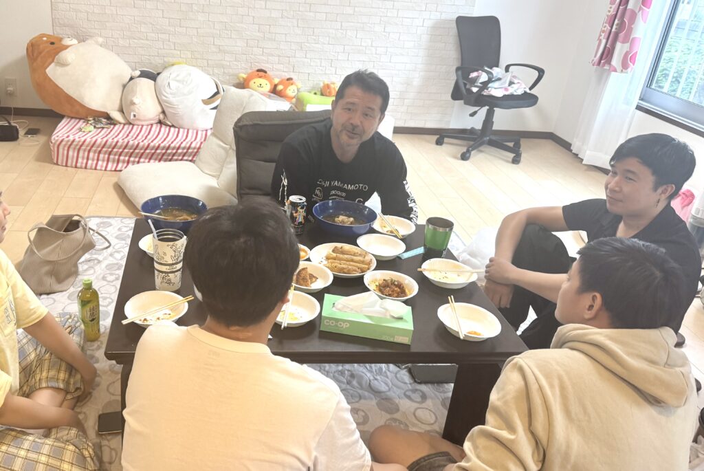 この日は、社宅で社員たちに料理を振る舞ってもらいました。この日の話題は、近況と合わせて、ご近所さんへの挨拶についても確認しました。